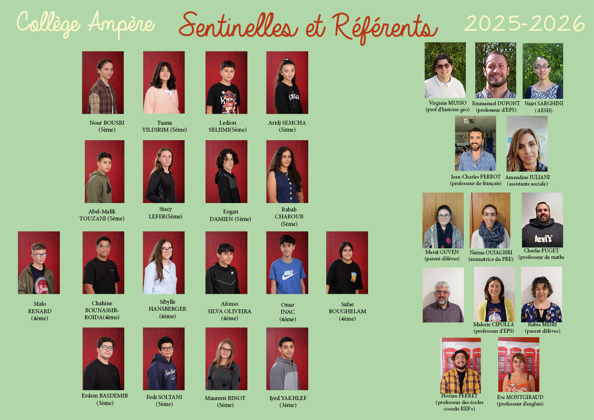 Afin de renforcer l’équipe « Sentinelles et Référents » présents au collège depuis l’année dernière, une nouvelle formation va avoir lieu le jeudi 11, vendredi 12, lundi 15 et mardi 16 décembre au collège de 8h à 16h. Tous les élèves de 6ème, 5ème et 4ème qui souhaiteraient candidater pour devenir des sentinelles sont invités à récupérer un questionnaire de candidature auprès de Mme Musso ou auprès de la vie scolaire et le rendre au plus tard mardi 2 décembre. Nous recherchons également un parent d’élève qui serait disponible aux dates de la formation et qui souhaiterait s’investir dans la lutte contre le harcèlement au collège (si vous êtes intéressés, merci de contacter Mme Musso, virginie.musso@ac-lyon.fr) L’équipe des référents et des sentinelles du collège Ampère